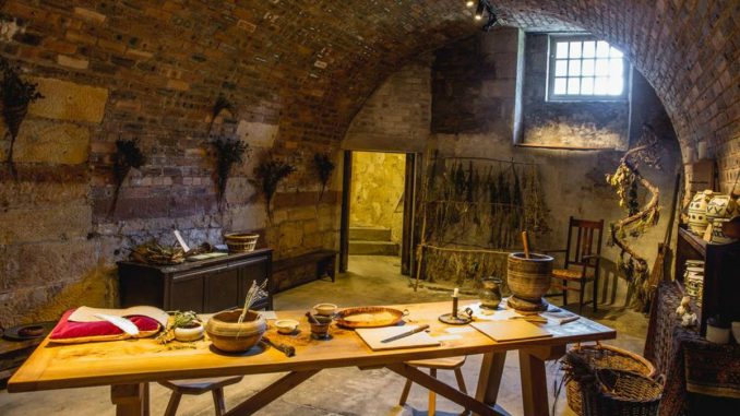 The kitchen area, below, is one of the lower rooms in the palace, and is recognisable as that which was used as the apothecary in ‘The Hail Mary’.
